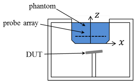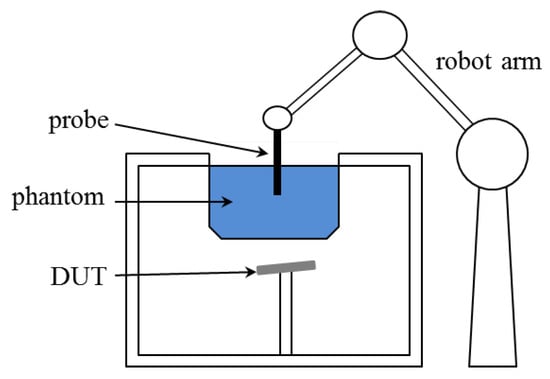 where V is the volume of the region of interest , is the root-mean-square of the electric field at the location , and and denote conductivity and density, respectively. is a cube with side length 1 mm for 1 SAR and mm for 10 SAR when . The value of depends on the wave frequency and the reference value can be found in the literature [22,23]. As seen from (1), the phase of the electric field is not required and thus only the amplitude is measured by the probe in the traditional measuring system, the composition of which is sketched in Figure 1, where a probe is moved by a robot arm to measure the amplitude of electric fields inside a phantom due to the emitting device under test. The integration in (1) is carried out numerically (e.g., by the trapezoidal rule) and the amplitude of the electric field is required at dense sampling points inside .