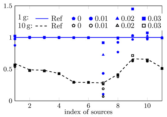 The computed peak 1 and 10 SAR of the 11 cases based on the reconstructed field are shown in Figure 4. For most cases, with the commonly used PWE approach, i.e., setting , the peak sSAR value can be accurately estimated. However, e.g., with respect to the first, seventh, and eighth case, increasing the value of significantly improves the estimation accuracy since a larger part of high spatial-frequency spectrum is considered. Note that the value of should not be too large due to the involved ill-conditioned problem. For instance, when is increased to 0.03, the estimated peak sSAR value changes from closely approximated solutions to a highly biased one. An insight into the ill-conditioned problem is given through the investigation of the field reconstruction problem with respect to the seventh case and the uncertainty analysis.