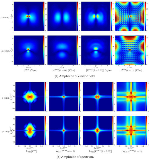 While the development of advanced field-reconstruction algorithms is not the concern of this paper, the challenges encountered in the field reconstruction can be presented. With respect to the seventh case, where the value of peak sSAR is underestimated, the amplitude of the reconstructed component of electric fields is shown in Figure 5a. The colour limits are set to be the same for each component. Note that since the z component is determined by the counterparts, only the x and y components of the electric field are shown. As observed, the electric fields with a large amplitude are distributed intensively in the spatial domain. Consequently, as shown by Figure 5b, the energy of the spectrum spreads widely and the high-frequency spectrum cannot be neglected. If following the commonly utilized approach and only reconstructing the spectrum constrained by , the smooth region of the electric field is well reconstructed but the small regions, which are centered at the peak values and influential to the estimation of the peak spatial-average SAR, are poorly reconstructed. Increasing by 0.03 to make more use of the spectrum, the reconstruction accuracy is improved. However, setting to 1 to consider the complete spectrum, very poor reconstructions are observed. From the corresponding spectrum, it is seen that the low-frequency spectrum is well retrieved but the high-frequency part suffers from large deviations. That is due to the ill-conditioning mentioned in Section 3.1. The effects of approximation errors in the PWE approach (e.g., due to insufficiently small sampling density) are amplified after the back-propagation stage of the reconstruction algorithm.