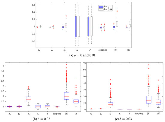 With 500 Monte Carlo trials, the estimated peak 1 SAR of the fourth case is plotted in Figure 6 indicating the uncertainty of all factors described in Table 3. The values of each factor are shown as a boxplot, a standardized way of portraying quartiles of a distribution of values [26]. As shown in Section 4.2, with no uncertainty, the 1 and peak 10 SAR are estimated with a high accuracy for the 4th case. With uncertainties, unbiased estimations are observed when , but an overestimation is likely to be obtained when , 0.02 or 0.03. The extent of the bias increases with . Besides, due to the ill-conditioning, the variance of the estimation increases with as a higher spatial-frequency spectrum is reconstructed. From the variance, one identifies the most influential factors. When or 0.01, the uncertainty of relative permittivity and conductivity contributes most to the variation of the estimation. Despite the large bias and variance of the estimation, the influence factors are changed as the z coordinate of the probe and the measurement (amplitude and phase) accuracy of the electric field when or 0.03. For validation purposes, a further 500 Monte Carlo trials were independently carried out; the obtained results led to the same conclusion.