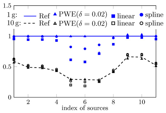 The estimated peak sSAR value of the concerned 11 cases by the traditional system and the measuring system applying the PWE field reconstructions is presented in Figure 7. Both linear and spline interpolation (and extrapolation) are used in the post-processing of the traditional measuring system. While for most cases all approaches yield well approximated estimations, the technique of spline interpolation seems superior to the linear one, most probably because of its greater approximation power. However, for the fifth, sixth, seventh and eighth cases, the estimation by the traditional system is largely biased, especially for the peak 1 SAR. In contrast, although the sampling density is smaller (7 mm for the fast system and for the traditional one), the approach based on field reconstructions yields more accurate estimations (except in the seventh case in the estimation of peak 1 SAR).