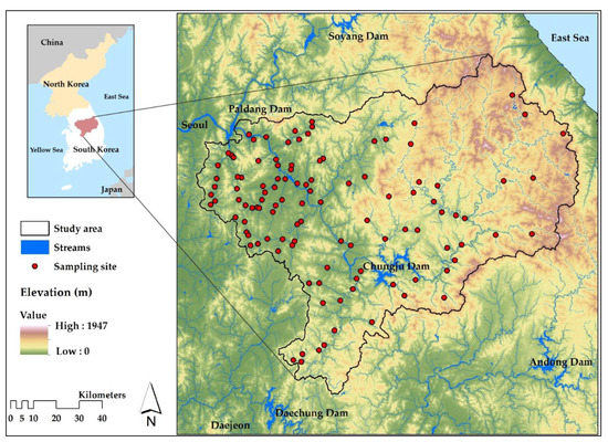 Our study area was the Nam-Han River watershed located in the center of the Korean peninsula (Figure 1). The Nam-Han River has a length of 375 km and covers approximately 37% (12,577 km2) of the total area of the Han River (34,473 km2). The Nam-Han River watershed consists of alpine topography, reaching elevations of >1000 m. The river flows in the form of an incised meander at midstream elevations of approximately 200m to 500 m, settling at 100 m in the downstream plain [34]. The average annual rainfall in the watershed is approximately 1409 mm, which exceeds the national average of 1159 mm. Two-thirds of the total annual precipitation occurs in summer (June-September), and streams dry out during spring (March–May) and fall (October–November), particularly in monsoon weather. The long-term annual average temperature over the last 30 years is 24.08 °C, with the lowest and highest average monthly temperatures in January (−3.9 °C) and August (24.4 °C), respectively [35].