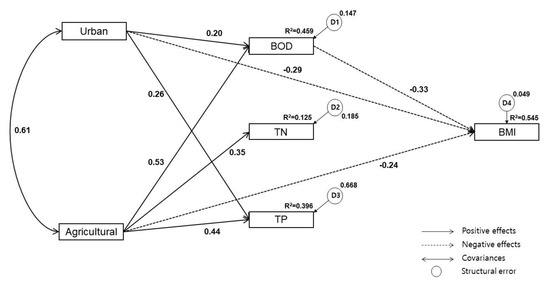 The urban and agricultural land use directly increase the concentration of BOD. The direct effects of urban and agricultural land use on TN were β = 0.07 and β = 0.39, respectively, but the impact of urban land use was not significant. The direct effects of urban and agricultural land use on TP were β = 0.24 and β = 0.45 respectively, and their direct effects on BMI were β = −0.30 and β = −0.21, respectively. The BOD, TN, and TP directly decreased the concentration of BMI, but the impacts of TN and TP concentrations were not significant. The indirect effects of urban and agricultural land use on BMI through BOD were β = −0.06 and β = −0.21 but their effects were not significant (Figure 4).