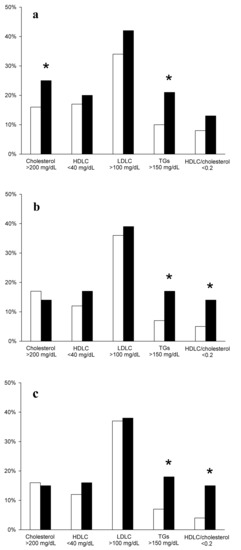 The percentage of abnormal lipid profiles differ between subgroups concerning TGs concentrations and HDL/cholesterol ratio. Either in the group of 280 inpatients with normal thyroid tests (Figure 1b) or in the 240 inpatients (after excluding patients treated with L-thyroxine, Figure 1c), an abnormally high concentration of triglycerides and an abnormally low HDLC/cholesterol ratio occurred more frequently in subjects with TSH ≥ 2.5 mIU/L. In the whole group of 466 inpatients (Figure 1a), a statistically significant difference was additionally found concerning cholesterol concentration.