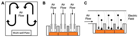 Another example of an undirected flow system was generated at UNC-Chapel Hill for the purpose of evaluating electronic cigarette (e-cig) exposures [96,97]. This system comprises a 17.8 × 17.6 × 10.0 cm3 Plexiglas chamber with an inlet port for e-cig devices operated at conditions to mimic vaping. A brushless fan within the chamber circulates the incoming puff, allowing high doses (0.25–1.0 mg/cm2) to be delivered. Conversely, the Air–Liquid Interface Cell Exposure System (ALICE) System, produced by the German Research Center for Environmental Health, is an example of a static system with undirected flow that is used for aerosol delivery [98]. Here, a small box contains inserts at the bottom in a heated platform, while an inlet port is located on top. The inlet port uses an aerosol cloud generator (a pulse of air over a powder or liquid solution) to introduce an aerosol cloud that can deposit over the cells due to gravitational settling of the cloud [98].