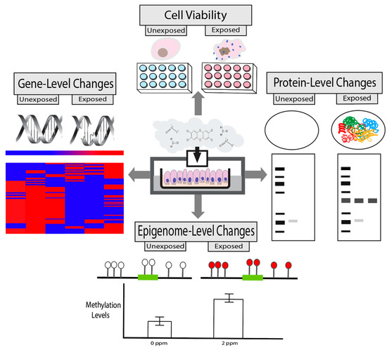 Types of toxicity endpoints relevant to air pollution exposure that can be evaluated through the use of in vitro models. A generic in vitro exposure condition held at an air–liquid interface, as an example, is shown in the middle, with various categories of toxicity responses that can be measured. For more information, see details within this review described under the overall categories of cell viability, gene-level changes, protein-level changes, and epigenome-level changes.