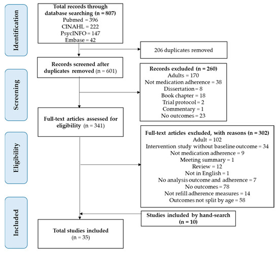 The systematic review process was guided by the Preferred Reporting Items for Systematic Reviews and Meta-Analyses (PRISMA) statement [18]. A systematic search was done on PubMed, EMBASE, CINAHL, and PsycINFO to identify studies on the use of RAMs as a measure of adherence in the pediatric setting. The search strategy involved the keywords “adherence”, “pediatrics”, and “refill records” and their variant forms. The full search strategy is detailed in Table S1. The initial search was performed on 30 April 2019, and a final search was conducted on 13 February 2020 to maximize the currency of this review.