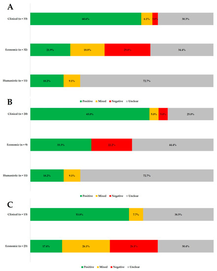 Categorization of economic, clinical, and humanistic outcomes in relation to medication adherence for studies that use (a) claims database and individual pharmacy database (b) individual pharmacy database only (c) claims database only. Positive: improved adherence significantly associated with improved clinical or humanistic outcome, or reduced healthcare utilization/cost. Negative: improved adherence significantly associated with reduced clinical or humanistic outcomes or improved healthcare utilization/cost. Unclear: no significant association reported between outcome and medication adherence. Mixed: a combination of positive, negative, and unclear.