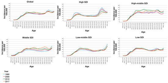 Trends for age-specific incidence rates for pedestrian road traffic injuries per 100,000 across sociodemographic indices 1990–2017. SDI: sociodemographic index.