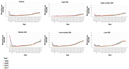 In Figure 4, we show the trends for age-specific mortality across SDI categories between 1990 and 2017. Globally, there is an increasing trend starting from the age of 10 to 14 years. Though mortality has reduced globally across all the regions, it is essential to note that the patterns in age trends have not changed in the last three decades.