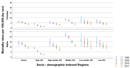 In Figure 5, we depict the mortality trends by sex per 100,000 population. Globally, across all SDI categories, men had a higher mortality rate than women over time. Globally, the death rate for men in 2017 was 8.90 (8.21 to 9.95) compared to a 3.62 (3.35 to 3.95) death rate for women, which equates to approximately 150% more deaths in men. Furthermore, in 2017, the smallest difference in mortality rate between sexes was observed in the HSDI category, where it was notably twice as high in men at a rate of 2.32 (2.25 to 2.42), compared to 1.07 (1.03 to 1.11) in women.