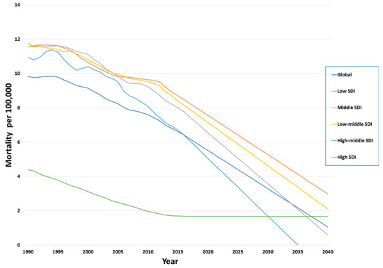 The prediction across SDI regions indicates a generalized decrease in trends in the age-standardized mortality rates. In HSDI categories, we observe a plateau in mortality as opposed to a comparatively sharper decline in other SDIs. Though the trend in declining mortality rates is observed in the LSDI category, the rate is much slower when compared with the other SDI categories. Globally the predicted death rate in 2020 is 5.53 (5.1 to 5.96) per 100,000 population. Globally, we are forecasting approximately 280,000 deaths in 2020, which are still preventable. In 2030, the expected global mortality rate is 3.3 (0.31 to 6.28) and 1.06 (−5.69 to 7.81) in 2040. The predicted mortality trend in 2030 with the SDI categories in LSDI is 5.29 (1.44 to 9.13), 3.58 (−0.54 to 7.7) in the MSDI, 4.64 (1.92 to 7.37) in the LMSDI, 1.7 (−8.77 to 12.17) in the HMSDI, and 1.67 (0.69 to 2.66) in the HSDI per 100,000 population. In 2040 however, across all regions, the death rate is close to one per 100,000 population with the exception of LMSDI, which appears to be twice the global average, and in the LSDI category, where the death rate is still three per 100,000 population.
