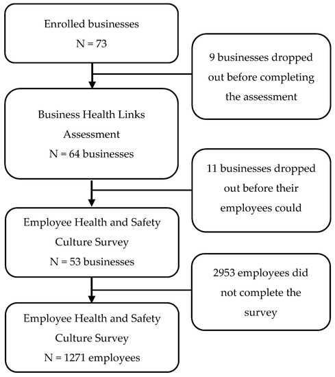 For the purpose of this study, we utilized cross-sectional data collected at the business and employee level. First, one person from each business completed the online Healthy Workplace Assessment™ through the Health Links website—www.healthlinkscertified.org—with consensus from team members including the health and safety team [5]. The respondents represent individuals in senior leadership, management, human resources, health and safety, and administration. The assessment contains 35 questions and takes approximately 30–60 min to complete. The assessment was developed based on measures from the Centers for Disease Control and Prevention Worksite Health ScoreCard, the National Institute for Occupational Safety and Health Total Worker Health model, the World Health Organization Healthy Workplace Framework, and a growing body of scientific research [5]. A full discussion of the Healthy Workplace Assessment can be found in Tenney et al. [5]. Next, employees at each business were given the online employee health and safety culture survey. Our research coordinator worked with the main contact at each business to email the survey link to all employees. First, a unique survey link for the business was generated. Then, the study coordinator sent our business contact an employee recruitment email with a copy of the survey link. Then, the business contact forwarded the email to all of their employees. The survey was open for two weeks, and a reminder email was sent one week before closing. If employees completed the survey, they were offered the opportunity to enter a raffle to win one of 15 $100 gift cards. No identifying information was collected in the survey, and the employer was blinded to the individual-level participation and responses.