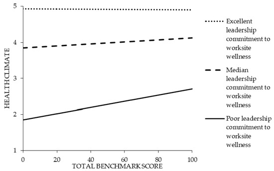 The interactive relationship between total benchmark score and leadership commitment to worksite wellness on health climate.
