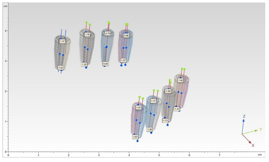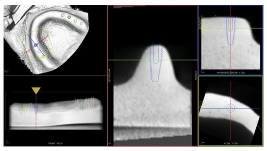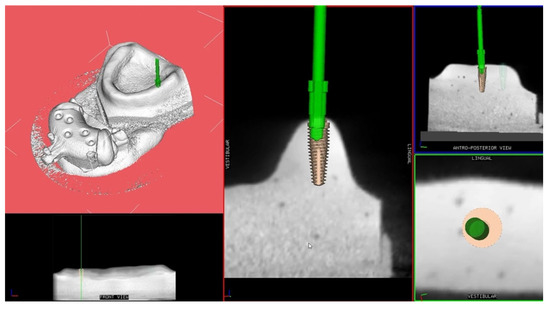 The time of each implant site preparation was measured. Then each model underwent a second CBCT scan. The DICOM data of the postoperative CBCT were imported to the software. From the digital library, dental implants (4 × 11.5 mm, conical, external hexagon) were chosen to optimally fit the drilled site. The implants were virtually positioned into every preparation site. Then the two CBCTs were superimposed and a blind outcome assessor quantified the accuracy, measuring the deviations between every planned implant and the virtually positioned one (Figure 4).