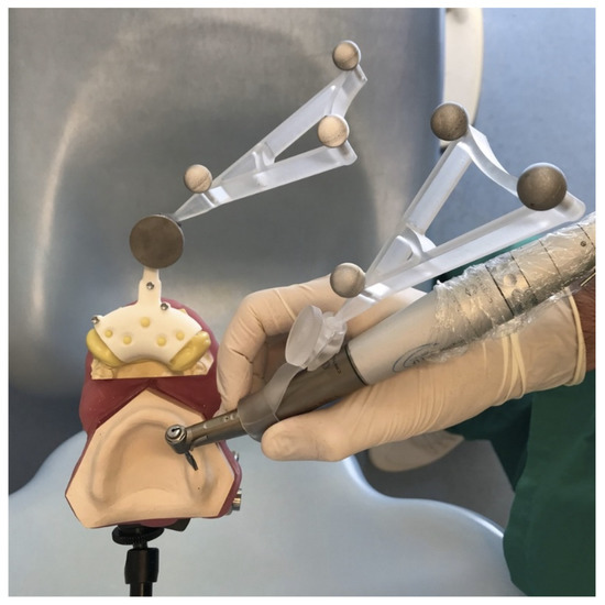 Drilling procedure. The reference tool is positioned on the model’s base and the tracking tools are placed on the reference tool and on the handpiece.
