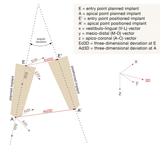For each implant surface, two points were identified by the intersection between the symmetry axis and the implant surface: the apical point (A) and the entry point (E). The distances between the planned implants and the positioned ones for each pair of corresponding points were identified. They were decomposed into linear components identifying three euclidean vectors: x = bucco-lingual vector (V-L); y = mesio-distal vector (M-D); z = apico-coronal vector (A-C). A line was drawn for each implant by calculating the inertial axis. The angular deviation, expressed in degrees, was calculated by measuring the angle of discrepancy between two corresponding lines. The vectors for both coronal and apical points identified 2D deviations (Adx = apical V-L deviation; Ady = apical M-D deviation; Adz = apical depth deviation; Edx = coronal V-L deviation; Edy = coronal M-D deviation; Edz = coronal depth deviation). The three-dimensional accuracy was provided by 3D errors (3D E and 3D A). A blind outcome assessor measured these deviations quantifying the implant placement errors. The following dependent variables were considered: Adx, Ady, Ad, Edx, Edy, Edz, 3D E, 3D A and angular errors (Figure 5). Accordingly, coronal deviations, apical deviations, vertical deviations and angular deviations were identified.