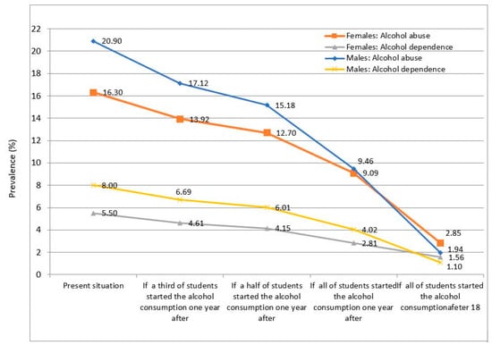 Bearing this in mind, we decided to assess how delaying the age of onset of alcohol use would affect the prevalence of alcohol abuse and dependence among the university students under study. The results showed important reductions in both conditions. In addition, delaying the age of onset of alcohol use until 18 years, an age at which in the US drinking is still illegal, suggests the importance of reinforcing compliance with current legislation, which could help reduce alcohol abuse and dependence among university students. It must be remembered that we did not adjust for some of the variables that previous authors have suggested may influence the age of onset [,], such as parental permissiveness or peer approval; however, adding other covariates would not imply an absence of the relationship found, and the calculations regarding the delay of the age of onset should not be greatly affected.