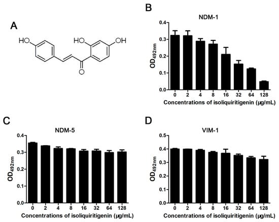 Figure 1. The effect of isoliquiritin on class B β-lactamase activity. The chemical structure of isoliquiritin (A). Enzyme inhibition assays were used to detect the activities of New Delhi metallo-β-lactamase-1 (NDM-1); (B), New Delhi metallo-β-lactamase-1 mutants (NDM-5); (C) and Verona integron-encoded metallo-β-lactamase -1 (VIM-1) (D) in the presence of various concentrations of isoliquiritin.