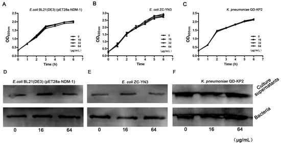 Figure 2. The growth curve of the NDM-1-positive bacteria in the presence of isoliquiritin. The tested strains E. coli BL21(DE3)(pET28a-NDM-1) (A), E. coli ZC-YN3 (B) and K. pneumoniae QD-KP2 (C) were cocultured with various concentrations of isoliquiritin, and the growth was determined by measuring the OD600 nm of each sample every 60 min. Western blot assays confirmed that isoliquiritin had no influence on the expression of NDM-1(DF). NDM-1-positive strains E. coli BL21(DE3)(pET28a-NDM-1) (D), E. coli ZC-YN3 (E) and K. pneumoniae QD-KP2 (F).