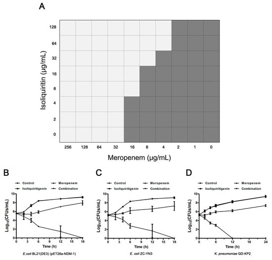 Figure 3. The synergistic effect of isoliquiritin and meropenem against NDM-1-positive bacteria in vitro. (A) A microdilution checkerboard test was used to show the combined effect of isoliquiritin and meropenem against E. coli BL21(DE3)(pET28a-NDM-1). Time kill assays confirmed that isoliquiritin (64 μg/mL) in combination with meropenem (4 μg/mL for E. coli and 8 μg/mL for K. pneumoniae) killed NDM-1-producing E. coli BL21(DE3)(pET28a-NDM-1) (B), E. coli ZC-YN3 (C) and K. pneumoniae QD-KP2 (D).