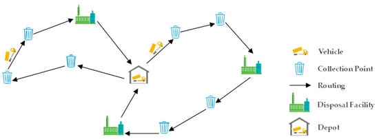 In the municipal solid waste (MSW) collection problem, the CVRP could be modeled as a minimum-cost flow problem in order to fit various requirements. It can be defined as collecting waste from a set of collection points by a homogenous or heterogeneous fleet of vehicles of fixed capacity that cannot be violated, each starting from and returning to the depot []. After collecting a certain amount of waste, vehicles need to unload at a disposal facility because of the capacity constraint of vehicles. However, due to the processing limit of disposal facilities, it is necessary to balance workload of disposal facilities. This paper adopts the penalty costs introduced by Jing-Quan Li et al. []. When the number of assignments distributed to a facility exceeds a given limit, it imposes a penalty cost in the total costs so as to diminish the unbalanced condition. After visiting a disposal facility, the empty vehicles can continue their trip to collect more waste. The objective of this model is to minimize total costs so as to arrange collection routes and distribute an appropriate number of vehicles to disposal facilities. Referring to Banyai et al. [] and Kim et al. [], a simplified diagram of the MSW collection process is presented in Figure 1.