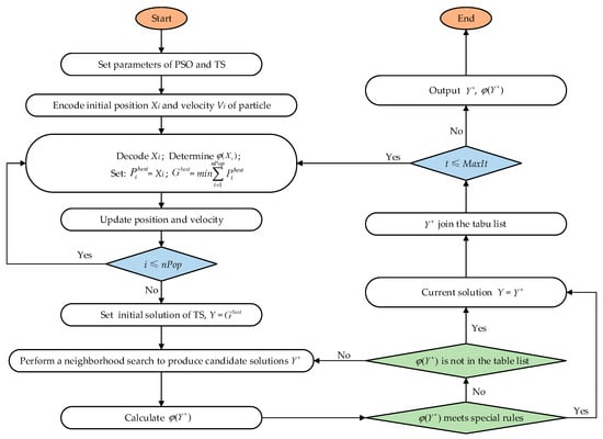 The operational flow of the proposed PSO-TS algorithm is described in Figure 2.