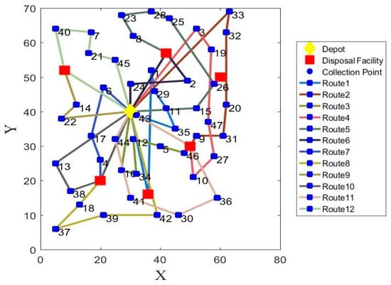 Constraint (8) ensures that all vehicles start from the depot with empty load. Constraint (9) ensures that the load of each vehicle will not exceed its own capacity. Constraints (10) and (11) illustrate that all points are served and each point is visited once by one vehicle. Constraint (12) addresses that the vehicle must empty the collection point visited. Constraint (13) states that only when vehicle h visits disposal facility r can the facility be used for dumping waste. Constraint (14) ensures that all vehicles return to the depot eventually. Constraint (15) ensures that the distance between two points is the same in both directions.