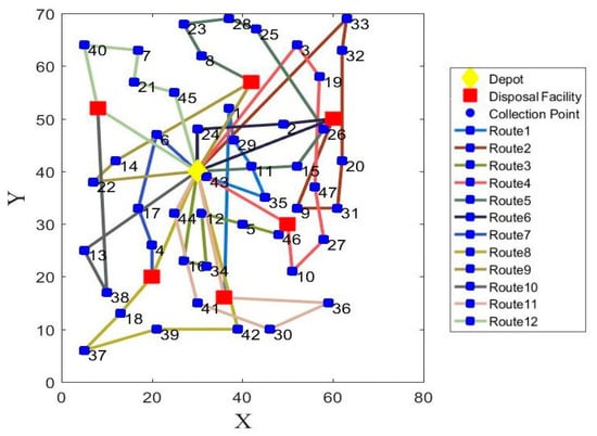Environmental aspects have been given attention in prior literature, but social concerns have rarely been studied []. Vinay Yadav et al. [] aimed at sustainable collection and transportation of MSW, and classified the corresponding mathematical models into three domains: vehicle routing, facility location, and flow allocation (efficient allocation of the MSW stream to processing facilities). Heidari et al. [] incorporated the social criterion so as to maximize the job opportunities brought about from the establishment of new disposal facilities in the MSW management system. Ramos and Oliveira [] studied the performance of equity with multiple depots in a recyclable waste collection system. By defining the service areas of the depots, the difference in workload (working hours) among depots was minimized. Li et al. [] considered the social benefits of balancing the collection trips assigned to recycling facilities. In this way, all facilities received almost the same number of the tasks so as to guarantee the employment of deprived people. Equity not only exists in the collection routes assigned for disposal facilities, but also can be addressed through minimizing the maximum route length or the route length gap between the longest and the shortest route lengths []. Jozefowiez et al. [] and Reiter and Gutjahr [] studied the vehicle routing problem with route balancing (VRPRB) and constructed a bi-objective model in order to minimize travel cost (or route length) and the maximum route length.