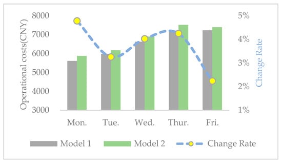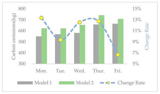 In recent years, there has been a considerable increase in the number of studies taking into account environmental issues by minimizing GHG emissions from logistic networks [,,]. The majority of the published research consider economic costs and environmental benefits together in the MSW collection process. Mahmuda Akhtar et al. [] introduced a concept of TWL (threshold waste level) to increase waste collection efficiency and reduce economic and environmental costs, including fuel consumption, fuel costs, and CO2 emissions. In their follow-up study, this method had an excellent optimization effect for week-long scheduling []. By using multi-objective decision-making approaches, comprehensive optimization was often performed so as to keep a balance between various objectives []. Tamás Bányai et al. [] introduced a cyber-physical system to simulate the waste collection process of downtown areas and guarantee energy usage cost-efficiency and environmental awareness of GHG emissions simultaneously. Bektas and Laporte [] put forward the pollution-routing problem, and designed vehicle routes aimed at minimizing the fixed costs of drivers, fuel consumption, and CO2 emission costs. Maurizio Faccioa et al. [] proposed a comprehensive multi-objective VRP (vehicle routing problem) model aimed at minimizing the total covered distance, the necessary number of vehicles, and the environmental impact.