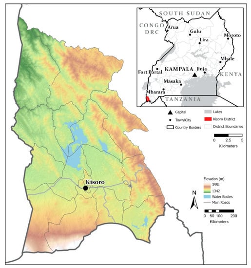 Kisoro is the chief town of Kisoro District, located in far southwestern Uganda, adjacent to the borders of Democratic Republic of Congo to the west, and Rwanda to the south (Figure 1). The area, at an elevation of 1890 m, is both volcanic and mountainous, with some nearby surface water (Lake Mutanda) but little available groundwater. In 2014, the town’s population was estimated at 15,859 and the district population was approximately 250,000 []. According to the 2014 Census, unemployment in the district of those aged 18 years and above was at 25.7% []. However, many jobs are unsecure and workers can go unpaid for months. The annual GDP per capita of Kisoro is estimated to be less than $200 USD [].
