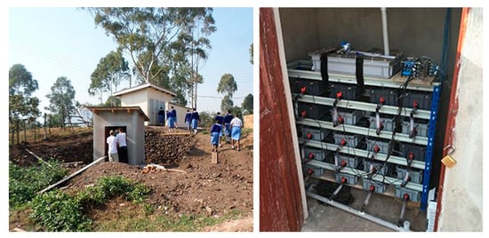 Photographs of Pee Power installation site (left) and system (right). In the left photo, building block located on the lower ground is where the Pee Power system was installed. The building on upper ground is an existing toilet block of the Seseme Girls’ Secondary School.