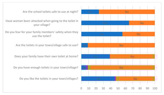 In 2015, all United Nations member states agreed to adopt the 17 Sustainable Development Goals (SDGs) which are an urgent call for action for a better and more sustainable future for all []. Goal 6 calls on nations to “ensure availability and sustainable management of water and sanitation for all” with eight more specific targets to be achieved by 2030, one of which (SDG 6.2) is to “achieve access to adequate and equitable sanitation and hygiene for all and end OD, paying special attention to the needs of women and girls and those in vulnerable situations”. There is considerable evidence that women and girls are at greater risk of maternal mortality, adverse pregnancy outcomes and non-partner sexual violence (NPSV) when using unimproved sanitation facilities [,,,]. Women’s stress and vulnerability in relation to sanitation provision increases even further during menstruation. This is due to a risk of feeling shame if seen or, in some cultures, through using the same facilities as non-menstruating women []. It is not only the lack of access to toilet facilities but also inadequate supporting services, such as poorly designed/constructed/maintained toilets or an absence of lighting, that can exacerbate these vulnerabilities [,]. O’Reilly has suggested the term “toilet insecurity” to describe “when safe, usable toilets are not available”, and asserts that sanitation for women and girls is closely linked to broader social structures of gender inequality [].