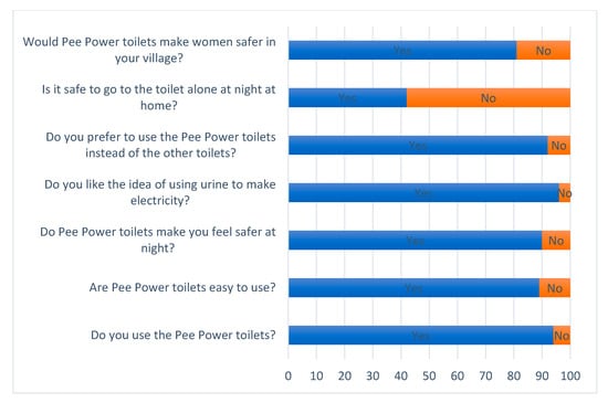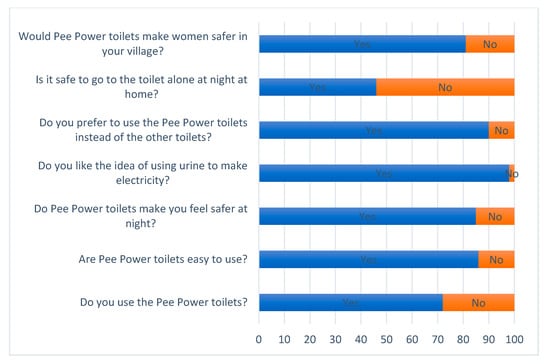 The 1st and 2nd post-installation surveys (Figure 6 and Figure 7), carried out one year apart, show how the Pee Power technology helps users to feel safer. Immediately after inauguration of the Pee Power toilets, 85% of school students said that the lights powered by Pee Power made them feel safer when using the toilets at night. The majority of girls (82%) thought Pee Power toilets would make women safer in their villages, due to the lighting. The 2nd post-installation survey was carried out one year after the commissioning of the Pee Power toilets and showed very similar results in terms of safety (Figure 7). Of course, feeling safe and being safe are not the same. However, several studies have reported that the lack of light in latrine cubicles is one of the reasons why women fear using toilets at night [,]. And as Cooper et al. pointed out [], this particular fear is a female stress factor around the sanitation issue generally. Additionally, according to the Headteacher of the school, there were no reported incidents of intrusion or assault on the pupils during the time that Pee Power was running at the school (personal communication, 21 February 2019). Therefore, providing safety by a relatively simple solution (i.e., MFC-powered lighting) is worth pursuing, especially with a renewable energy technology such as Pee Power. Focus group participants noted: “I like the Pee Power toilets because I could see a man hiding at night”, and: “Pee Power toilets are safer than the other school toilets because of the lights. With them around the toilet block it is bright enough to see if any strangers are present”.