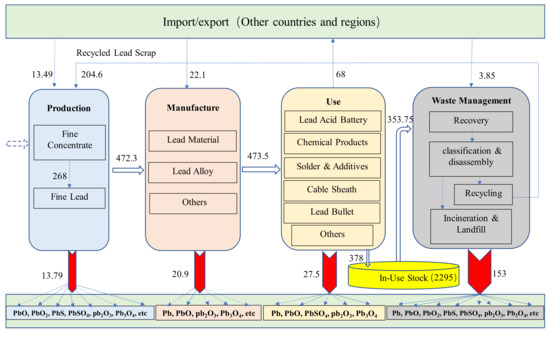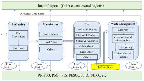 Lead (Pb) is a naturally occurring element found in the earth’s crust with various uses, largely owing to its malleability and corrosion resistance. Multiple uses of Pb during the 20th century, including leaded petrol, lead-based paint, and solder in water pipes, have resulted in elevated Pb exposure risk to humans. Young children, in particular, are more vulnerable to Pb exposure due to their frequent hand-to-mouth activity, higher absorption rates, and their developing central nervous system [1]. As a newly industrialized country, China’s demand for mineral resources and per capita consumption have increased year by year [2]. In 2017, China’s refined lead consumption reached 4.723 million tons, accounting for 42% of global consumption [3]. While satisfying the consumption of mineral resources, China has also produced a large amount of waste. This waste increases by 10% every year [4]. The waste contains rich mineral resources, and the recycling of resources slows down the rate of natural mineral depletion [5]. Therefore, the analysis of metal resource material circulation or economic metabolism has gradually become a research hotspot. Luca et al. (2011) clearly depicts the whole process of production, consumption, social accumulation, and recycling of China’s aluminum metal through material flow analysis, providing support for the Chinese government to formulate resource policies [6]. It can also provide quantitative scientific methods for promoting cleaner production and a circular economy [7]. In addition, material flow analysis is also widely used in the analysis of the recycling efficiency of lead and hazardous material flow networks [8]. This can help humans to identify and predict the flow and direction of specific substances, and scientifically analyze the efficiency of human resources utilization. The higher the efficiency, the lesser the impact on the environment, and the better the human control ability [9].