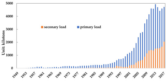 The lead used by human beings originally came from the lead ore mined in mines. Lead ore concentrate with a lead content of about 60% is formed after beneficiation. Lead concentrate is smelted to produce lead metal with a purity greater than 99.97%, which is called refined lead. Among them, the refined lead produced from lead concentrate is called primary lead, and the refined lead produced from lead containing waste is called recycled lead. Figure 2 shows the production changes of primary and secondary lead in China from 1949 to 2017. In 2017, China’s production of primary lead and recycled lead was 2.677 million tons and 2.046 million tons, respectively.