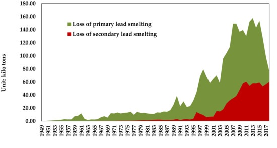 Lead material loss in lead smelting stage in China from 1949 to 2017. (Data source: [3,23]).