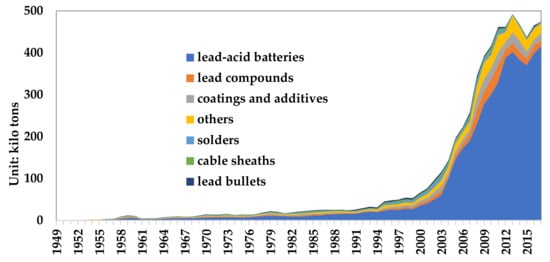 In this paper, lead loss is estimated by referring to the national standard of the China Emission Standard of Pollutants for Battery Industry (GB 30484-2013). The lead emission limit of water pollution unit production in the process of plate manufacturing and assembly of existing lead–acid battery enterprises is 0.2 kg/kVAh. Compared with the lead content of 20 kg/kVAh, the loss rate is only 1%. The production process of lead–acid batteries is divided into lead powder and grid manufacturing, paste mixing, curing assembly, and other processes. The waste containing lead in the processing and manufacturing is mainly lead alloy and lead paste. The comprehensive loss rate of PbSb alloy (95% Pb) and PbAl alloy (96% Pb) is 2%. Lead Oxide and lead salt are mainly used in stabilizers, lead paste of lead–acid batteries, lead glass, and others. The lead loss rate in the process is 1%. According to the calculation, the cumulative loss of lead in China’s processing and manufacturing stage from 1949 to 2017 was 3.69 million tons from leadؘ–acid batteries, 210 kilo tons from 1lead alloy, and 120 kilo tons from lead oxide, respectively.