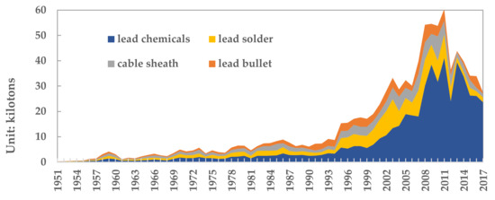 For non-dispersive lead containing products, there is no lead loss and emission in the use process. It is difficult to recycle the lead of the lost lead products (such as lead chemicals, lead solder, cable sheathes, and lead bullets). This paper assumes that it is completely dissipated into the environment. From 1949 to 2017, the lead losses of lead chemicals, lead solder, cable sheaths, and lead bullets were 5.24 million tons, 1.81 million tons, 1.35 million tons, and 1.09 million tons, respectively, as shown in Figure 6. Among them, the losses were 237 kilo tons, 19 kilo tons, 14 kilo tons, and 5 kilo tons respectively in 2017.
