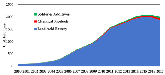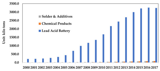 From 2000 to 2017, China has recovered 17.13 million tons of lead–acid batteries, 540 kilo tons of lead chemicals, and 1.04 million tons of solder and additives. As shown in Figure 8. In 2017, China recycled 1.866 million tons of lead–acid batteries, 70 kilo tons of lead chemicals, and 110 kilo tons of solder and additives.