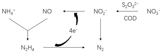 Theoretically, anammox and denitrification coexist symbiotically in an actual engineering context and they occur in similar ecological environments. Anammox produces approximately 11% NO3−-N [], and denitrification can remove NO3− from anammox and supply anammox bacteria with nitrite, which achieves the goal of removing TN and chemical oxygen demand (COD) (Figure 1). However, the COD and conversion efficiency of ammonium (CEA) of sewage fluctuate, and it is significant to analyze the appropriate S/N ratio for maintaining the maximum nitrogen removal efficiency (NRE).