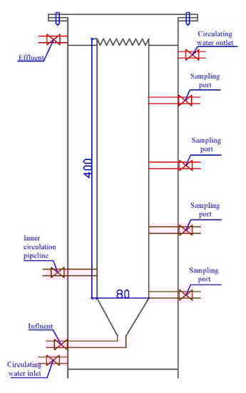 In this study, a lab-scale EGSB reactor (approximate volume of 2 L, with a height of 400 mm and an inner diameter of 80 mm) was used to establish the A/SAD/HD system (Figure 2). The EGSB reactor was equipped with a water bath temperature control system and was continuously operated at 32 ± 2 °C; the hydraulic retention time (HRT) was maintained at 3 h. Synthetic wastewater containing ammonium sulfate, sodium nitrate, sodium acetate, sodium thiosulfate, and other macro and microelements [] was fed into the reactor. Components and concentration of macro and microelements (mg L−1): KH2PO4 27.2, CaCl2·2H2O 180, MgSO4·7H2O 300, KHCO3 500; and 1.25 mL L−1 trace element solutions A and B. Trace element solution A contained (g L−1): Ethylene Diamine Tetraacetic Acid (EDTA) 5 and FeSO4 5; Trace element solution B contained (g L−1): EDTA 15, H3BO4 0.014; MnCl2·4H2O 0.99; CuSO4·5H2O 0.25; ZnSO4·7H2O 0.43; NiCl2·6H2O 0.19; NaSeO4·10H2O 0.21; NaMoO4·2H2O 0.22; and CoCl2·6H2O 0.24.