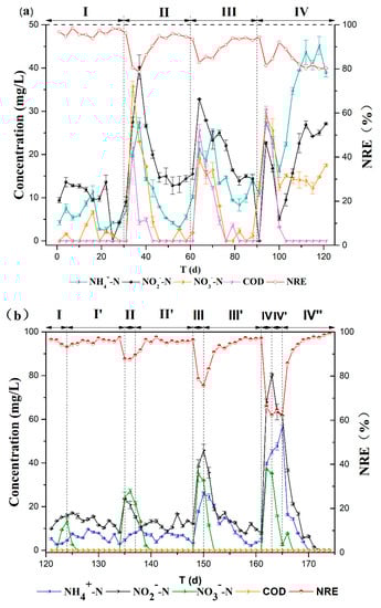Figure 3a shows the NRE of the A/SAD/HD reactor during the organic change stage. Without the addition of organic matter (phase I), the average NRE achieved in this reactor gradually reached 97.3% on the last five days of phase I, which is comparable to those of other A/SAD systems [,]. During phases II–IV, sodium acetate was fed to the reactor to promote heterotrophic denitrification. With an influent COD of 50 mg/L (phase II) or 100 mg/L (phase III), effluent NH4+-N, NO2—N, and NO3−-N accumulated at the beginning of each phase, resulting in a slight decrease in the NRE, possibly because HD bacteria require a certain adaptation period []. After adaptation, effluent NH4+-N, NO2—N, and NO3−-N decreased significantly in both phases II and III and the corresponding NRE reached 95.0% ± 0.5% and 93.6% ± 0.8% on the last five days of phases II and III, respectively. These results indicated that the S/N ratio regulation strategy could achieve optimal operation performance with influent COD concentrations of 50 mg/L and 100 mg/L in the A/SAD/HD system.