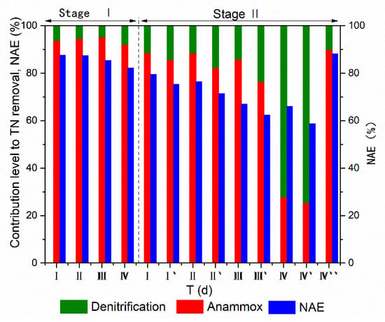 To evaluate the nitrogen metabolic pathways in the reactor, the contribution rates of anammox and denitrification to TN removal were characterized in different phases. As shown in Figure 4, the contribution rate of anammox to TN removal slightly increased (from 93.6% to 95.1%) with the addition of organic matter in stage I (phases I–III), which was consistent with other studies []. This indicated that autotrophic and heterotrophic denitrification processes mainly provided nitrite for anammox. Previous studies have demonstrated that partial denitrification can cooperate with anammox in an A/SAD system [,], and this cooperation relationship is further increased in an A/SAD/HD system. However, when the organic matter content was higher than 100 mg/L (phase IV in stage I), the contribution rate of anammox to TN removal markedly decreased to 91.9% and the decreasing NAE indicated that a decreasing amount of nitrite was transformed to nitrogen through denitrification. Previous report shows that high concentrations of COD can inhibit the activity of anammox bacteria in reactors [] and that a high organic content facilitates the occurrence of complete denitrification. Although the organic content was not high in this study, a similar effect occurred: an intense competition between anammox and denitrification occurred in this A/SAD/HD system.