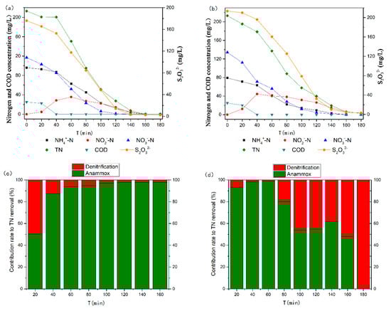 Dynamics of nitrogen removal and thiosulfate consumption and the contribution rates of denitrification and anammox to TN removal in batch experiments: (a,c) CEA 55%, S/N 1.24, COD 25 mg/L; (b,d) CEA 63%, S/N 1.38, COD 25 mg/L.