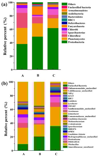 Variations in microbial community structure in the A/SAD/HD reactor at the phylum (a) and genus (b) levels. (A: the end of phase I (stage I); B: the end of stage I; C: the end of stage II.)