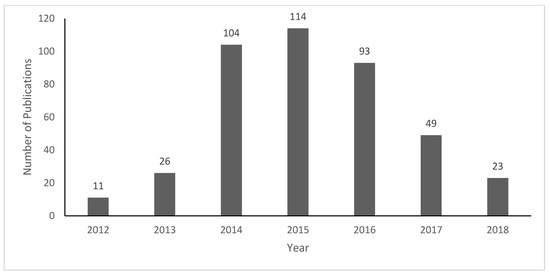 Searching the core clinical journals on PubMed for our keywords resulted in 555 publications. After applying inclusion and exclusion criteria, a total of 421 publications were coded and analyzed. Figure 1 shows the frequency of core clinical ENDS publications by year between 2012 and 2018. The number of publications peaked in 2015 (n = 114), and decreased annually since 2015, with only 23 publications in 2018.