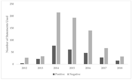 Figure 2 shows the number of unique positive and negative statements about ENDS made over time in unique publications. The number of positive and negative statements year to year roughly followed the pattern of number of publications (Figure 1). However, Figure 2 shows a substantially higher number of negative statements in all years, especially between 2014–2017. Although both positive and negative statements declined after 2014, the rate of decrease in negative statements was much higher, such that by 2018, the ratio of negative to positive statements was considerably smaller than in previous years.
