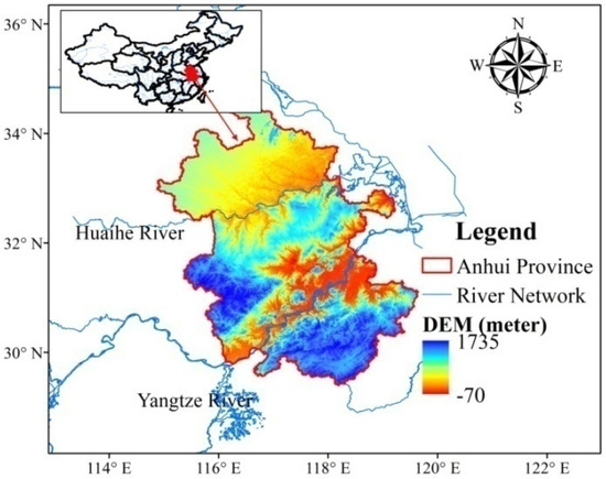 Anhui Province is in the southeast of China’s interior and at the middle and lower reaches of the Yangtze and Huaihe Rivers, at 29°41′–34°38′ N and 114°54′–119°37′ E (Figure 2). It extends across the Huaihe, Yangtze, and Xin’an Rivers and is 450 km wide from east to west and 570 km long from south to north, covering an area of 140,100 km2. The area has varied topography, including plains, hills, and mountains, which represent 24.1%, 28.9%, and 29.4% of the total, respectively. The landform in the area is composed of the Huaihe River basin, Jianghuai tableland and hills, the West Anhui hilly mountains, the Yangtze River plain, and the mountain area of South Anhui. The terrain gradually declines from the mountain core to the valley, and the mountains are mostly distributed in north–east and east–west directions.