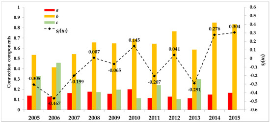 Figure 3. Connection numbers and corresponding sf(ut) values for evaluating regional water resources carrying capacity (RWRCC) from 2005 to 2015 in Anhui Province.